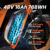 Explore more with a UL 2849 48V 16Ah (768Wh) battery that delivers up to 50 miles on pedal assist or 30+ miles on throttle. Perfect for long rides, weekend getaways, or daily commutes.